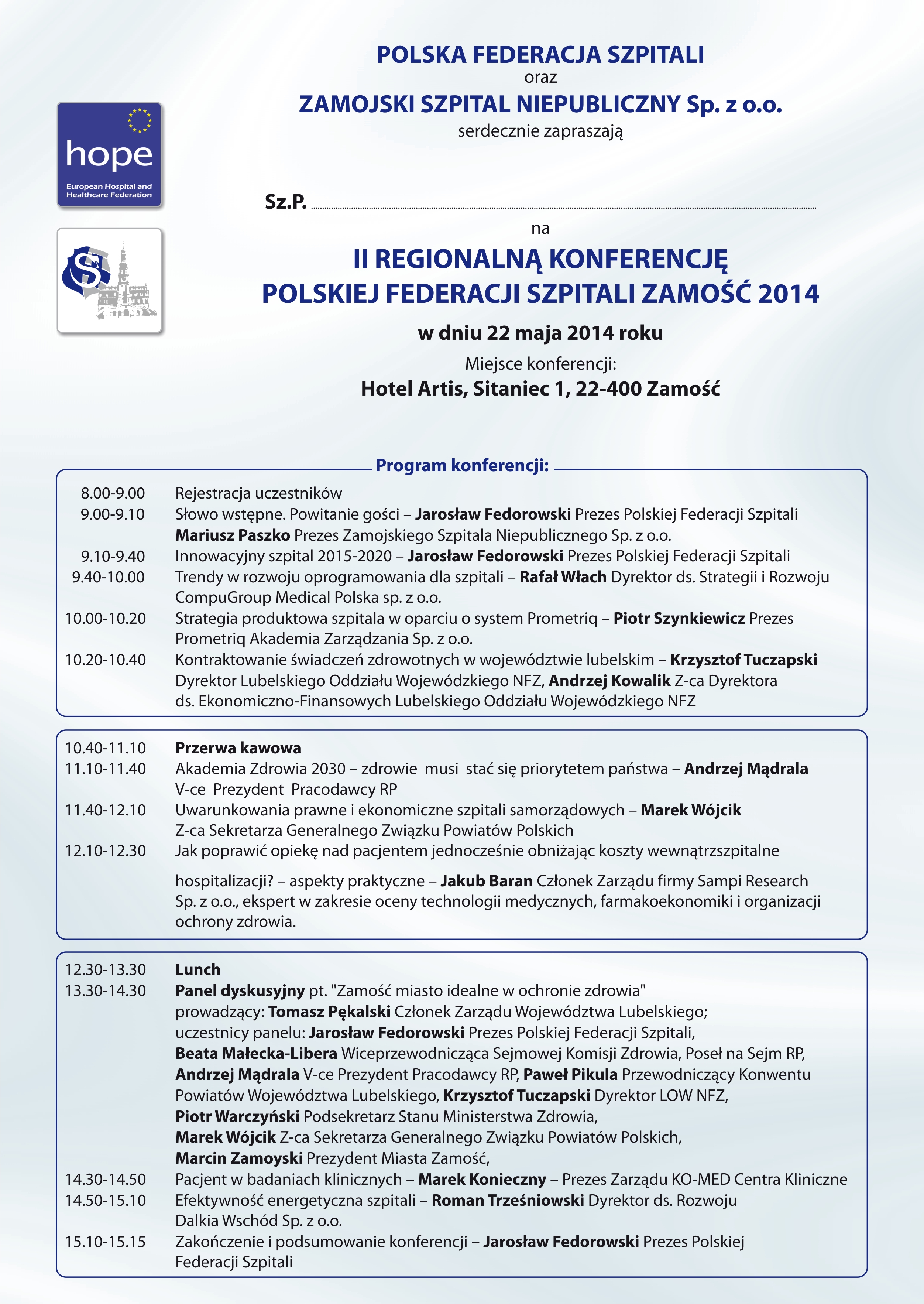 25.02.2015 Zapraszamy dyrektorów szpitali na trzecie wydanie regionalnej konferencji PFSz w Zamościu. Szczegóły zostaną podane na stronie Zamojskiego Szpitala Niepublicznego: