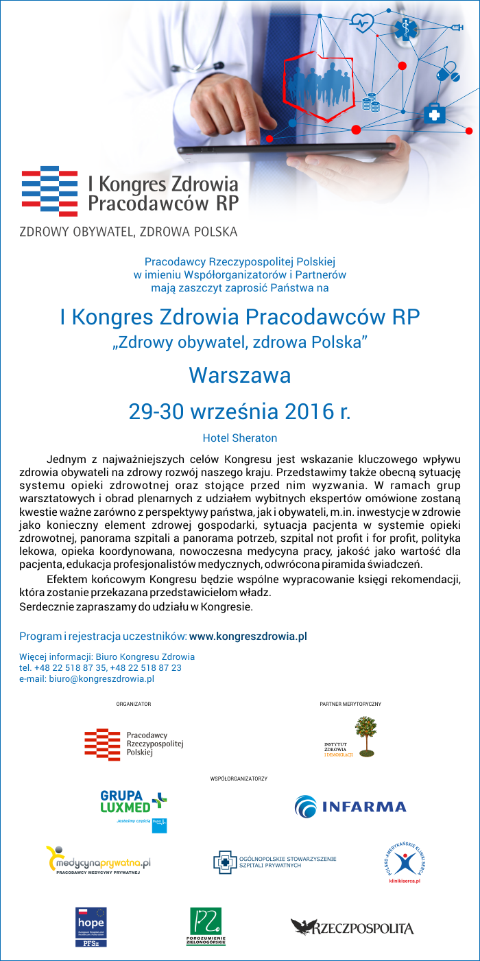 15.07.2016 Polska Federacja Szpitali zaprasza na I Kongres Zdrowia Pracodawców RP, w Warszawie, 29-30.09.2016.