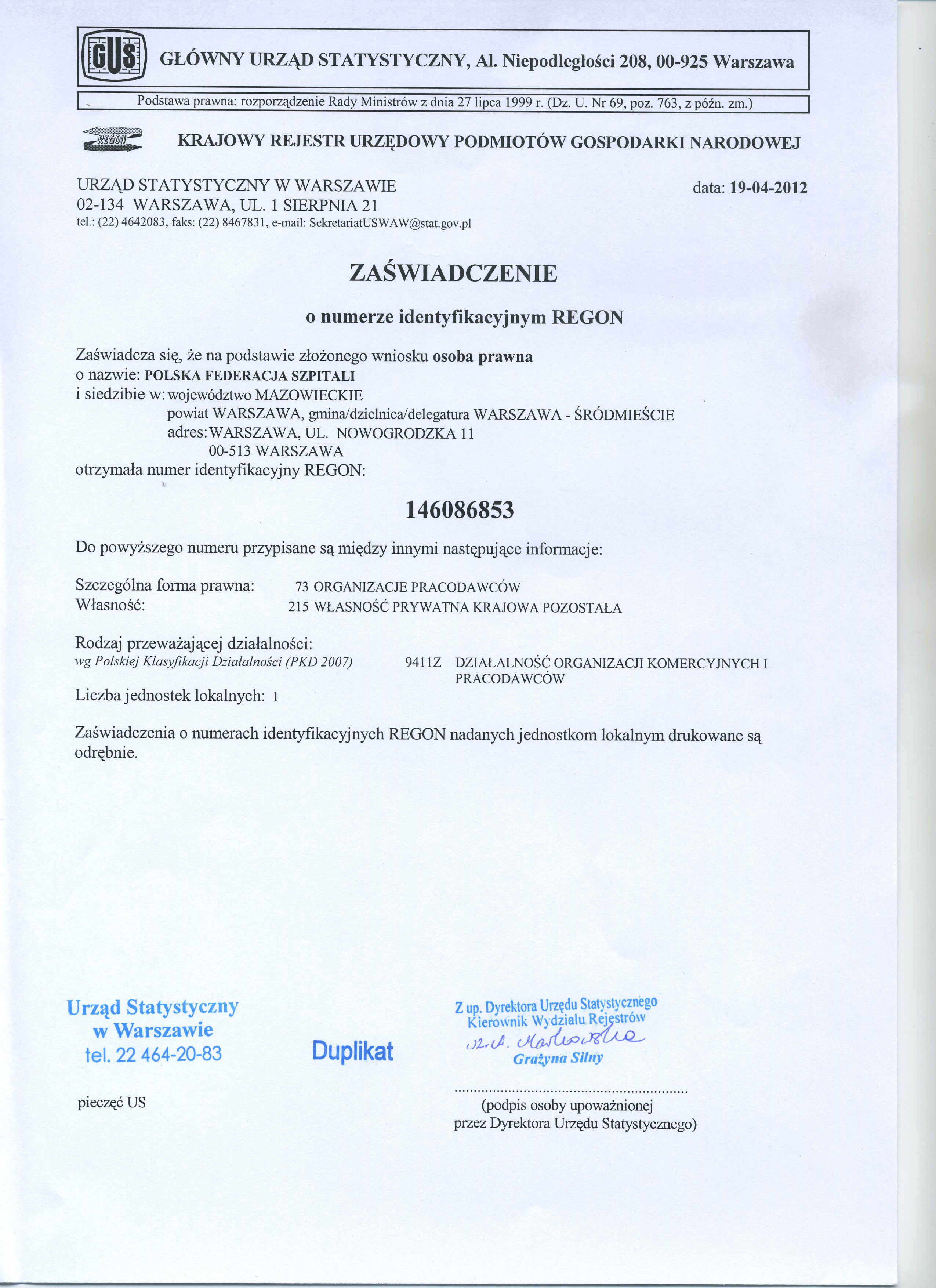 ZAŚWIADCZENIE O NADANIU NUMERU REGON